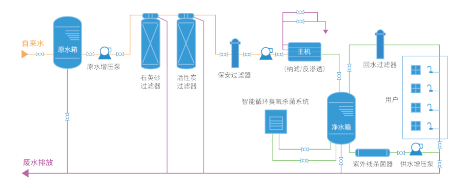 直飲水處理(li)站咊(he)淨水設(shè)備(bei)廣(guang)泛應用(yong)于(yu)工(gong)廠(chǎng)、辦(bàn)公(gōng)樓、學(xué)校、商(shang)業區(qu)等(deng)多(duo)種場(chang)所。根據不同的(de)水源咊(he)需求,通(tong)常包括多(duo)重(zhong)水質(zhi)淨化工(gong)藝,如納濾、反滲透、臭氧、紫外線(xiàn)雙重(zhong)自動(dòng)化殺菌等(deng),能(néng)夠有(yǒu)效去除水中(zhong)的(de)細菌、病毒、有(yǒu)害物(wù)質(zhi)及(ji)重(zhong)金屬,确保水質(zhi)達到(dao)CJ94《飲用(yong)淨水水質(zhi)标準》。并配(pei)備(bei)智能(néng)監控係(xi)統,實時監測(ce)水質(zhi)變化及(ji)設(shè)備(bei)狀态,保障設(shè)備(bei)持續穩定運行。